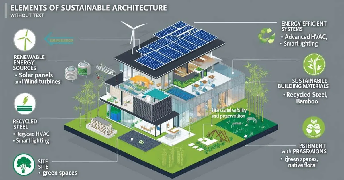 - Sustainable architecture integrates several key components that work synergistically to create environmentally responsible and resource-efficient buildings. One of the primary elements is the use of renewable energy sources, such as solar panels, wind turbines, and geothermal systems. These energy sources significantly reduce reliance on fossil fuels, lowering greenhouse gas emissions and promoting energy independence.